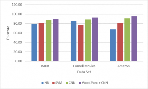Here Figure 4 shows the accuracy of proposed model with of state of art mechanisms of NB, SVM and CNN models on three different data sets of IMDB, Cornell Movies and AMAZON reviews. The graph shows that proposed model performed with respect to the all other models in all the data sets we considered.