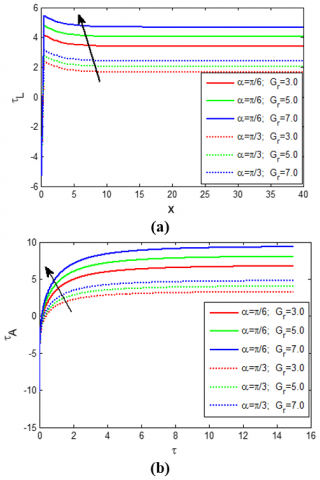 Figure 27. (a) Local Shear stress ${{\tau }_{L}}$ for different values of Grashof number${{G}_{r}}$ (b) Average Shear stress ${{\tau }_{A}}$ for different values of Grashof number ${{G}_{r}}$