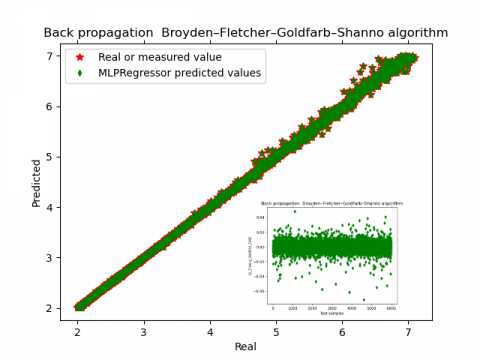 All the MLP prediction is performed using random datasets, with the same training to testing ratio. The MLP model trains using the back-propagation algorithm based on the least square error as the loss function which optimizes the squared-loss using limited-memory-BFGS. The MLP model errors and accuracy parameters are given in Table 1.